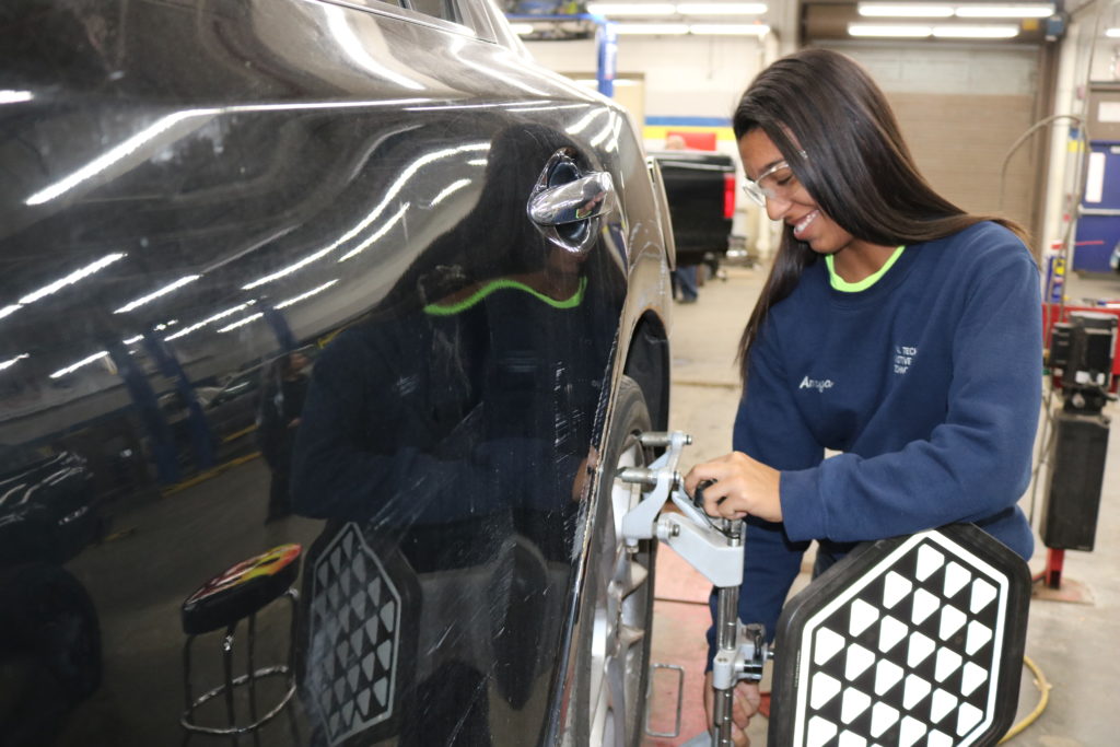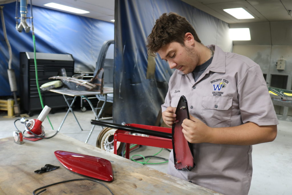 Students in the Automotive Collision Repair and Refinishing program learn safety, tools and equipment, damage analysis, component replacement, sheet metal straightening and filling, welding, painting and refinishing, detailing, and introduction to frame straightening and mechanical systems.